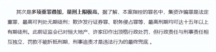 除此之外,许家印在法庭上有多项罪名叠加,量刑上限非常高,即便许家印当庭认罪悔罪,宽大处理的可能性也并不高。